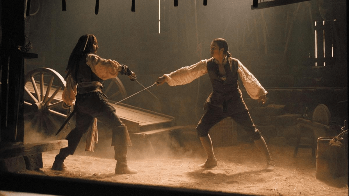 I approach fights from a story and character point. There is a special kind of truth that can be revealed about characters and situations when violence is introduced in a story. If the scene would tell the story just as well without a fight, then the fight can easily become unnecessary and even boring — no matter how flash and spectacular! If the scene, without the fight, is missing something vital, then that is the first goal of the choreography. In Pirates of the Caribbean: Curse of the Black Pearl there’s a blacksmith fight. If the scene were to have Will find Jack in his shop, question him, then have Tom knock him out with a bottle, we’d lose the character development that seeing them fight brings us. It shows that Will has built skills that Jack’s experience has not given him, but Jack’s savvy trumps Will’s naivety.