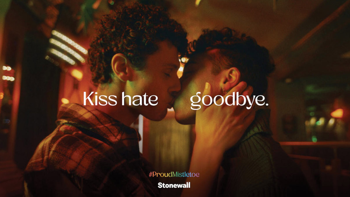 Following the rise of homophobic hate crime (London is up 30% in a 10-year high) LGBTQ+ rights organisation Stonewall — working with Ogilvy and Gay Times — invited the queer community to ‘kiss goodbye to hate’ under rainbow coloured mistletoe; to the track ‘Merry Christmas. I don’t want to fight tonight‘, by Joey Ramone.